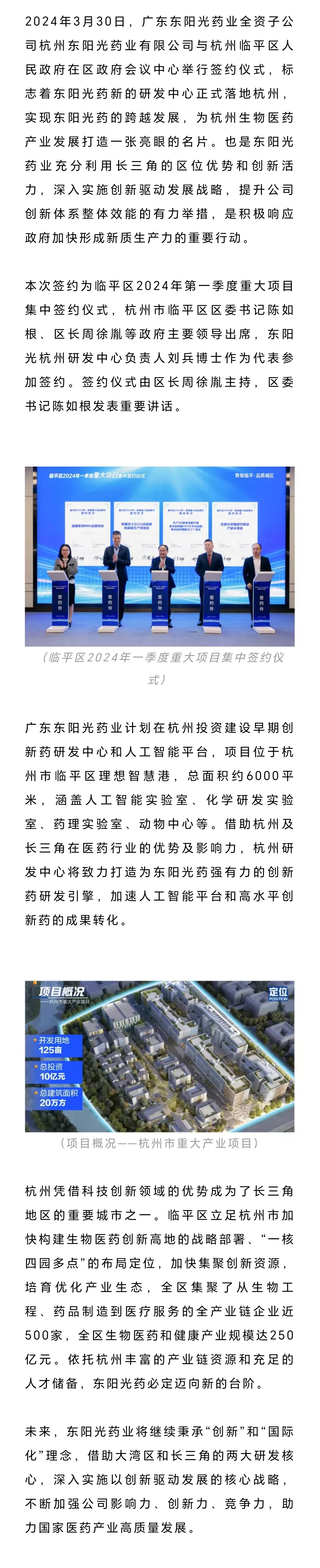 入驻长三角,启航新征程 | 广东东阳光药业杭州研发中心正式签约
